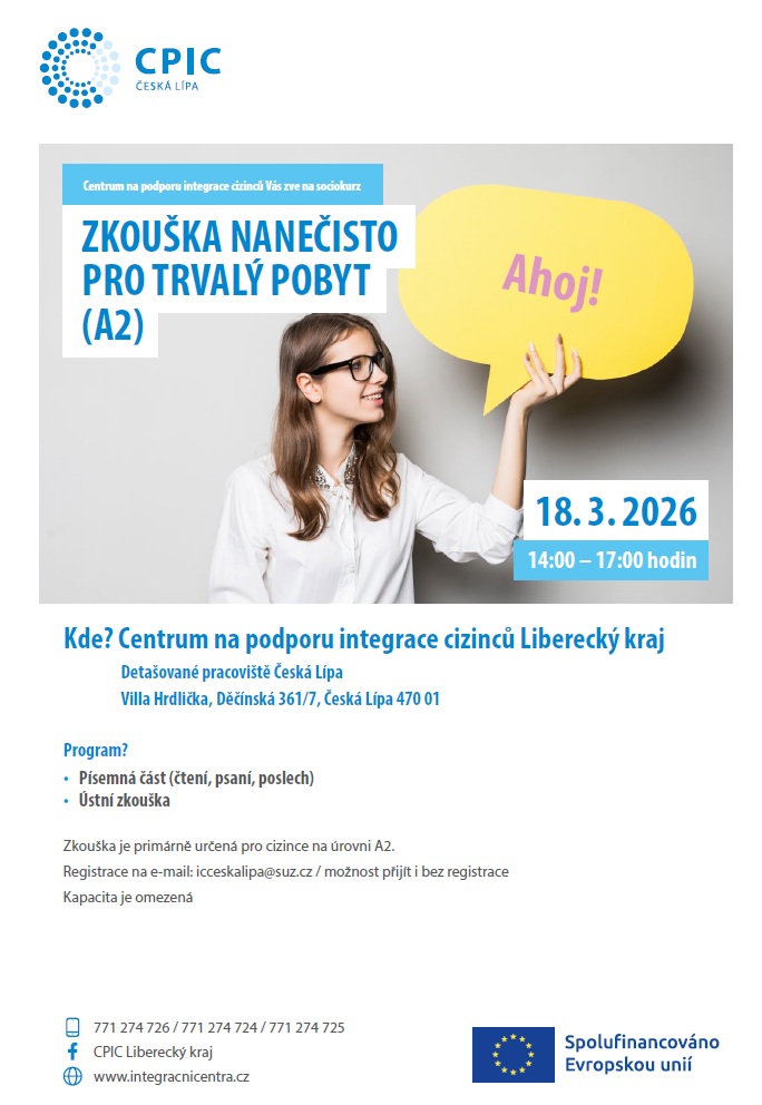 Centrum na podporu integrace cizinců, Liberecký kraj, detašované pracoviště Česká Lípa (Villa Hrdlička, Děčínská 361/7), pořádá sociokulturní kurz Zkouška nanečisto pro trvalý pobyt (A2).